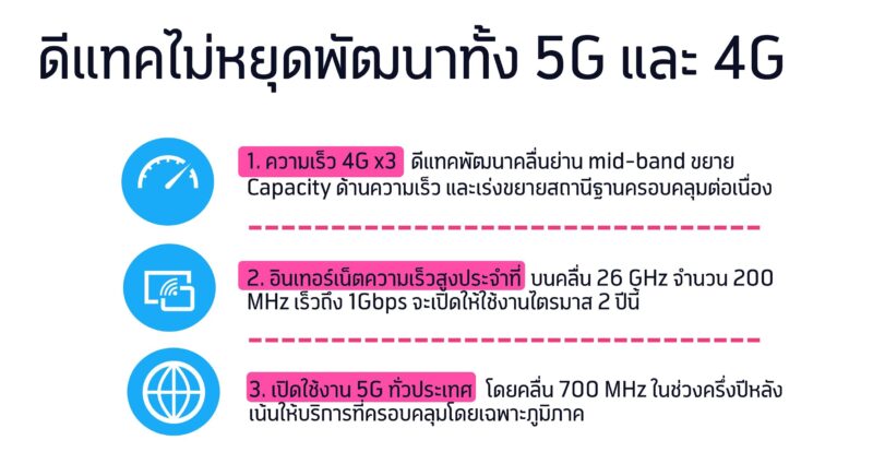 - สิ่งที่ดีแทคต้องการคือคลื่น 26 GHz ในการนำมาทำ 5G ดังนั้นในการประมูลดีแทคจึงประมูลคลื่นย่านความถี่สูง และประมูลคลื่นมา 200 MHz ซึ่งเพียงพอในการให้บริการใน ecosystem