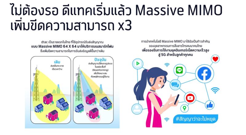 - ดีแทคนำ เทคโนโลยี Massive MIMO เพื่อเพิ่มประสิทธิภาพการรับส่งสัญญาณที่ดีกว่าเดิม 3 เท่า สำหรับบริการ 4G TDD ด้วยการเพิ่มความสามารถ (Capacity) ในการให้บริการอินเทอร์เน็ตความเร็วสูงเพื่อใช้งานรับชมวิดีโอ ความละเอียดสูง แบบ Full HD และการใช้งานอินเทอร์เน็ตอื่นๆ ให้แก่ลูกค้า โดยเฉพาะในพื้นที่ที่มีผู้ใช้งานหนาแน่นและบริเวณตึกสูงอย่างในเขตกรุงเทพมหานคร ซึ่งเป็นพื้นที่ที่มีความต้องการใช้งานข้อมูลในปริมาณมาก และยังมาพร้อมกับ Beamforming ด้วยการส่งสัญญาณแบบเลือกพื้นที่ที่กำหนดได้ตรงจุดเพื่อตอบสนองพฤติกรรมการใช้งานได้แม่นยำ การนำ Massive MIMO มาใช้ นับเป็นก้าวสำคัญของอุตสาหกรรมการสื่อสารโทรคมนาคมไทย เพื่อรองรับการใช้งานยุคอินเทอร์เน็ตความเร็วสูงในอนาคต