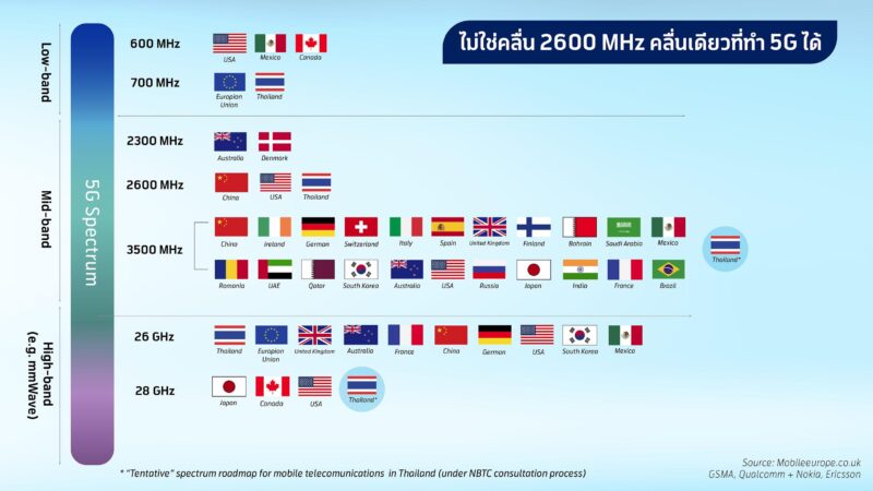 - ประเทศไทยจะมีแผนจะจัดสรรคลื่นความถี่ 3500 MHz ซึ่งมีขนาด 300 MHz ซึ่งเป็นทางทางเลือกที่เหมาะสมสำหรับการให้บริการ 5G ให้สอดคล้องกับทั่วโลก