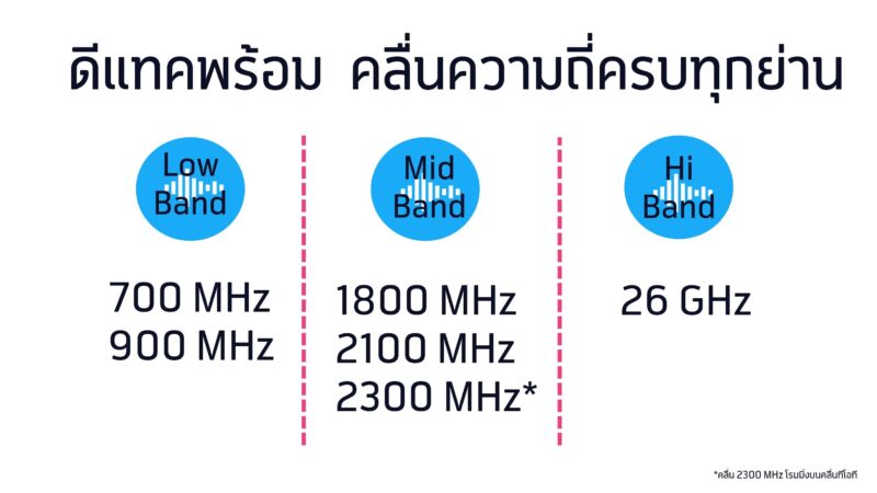 - สำหรับคลื่น 700 MHz เป็นคลื่นความถี่ต่ำ ดีแทคจะนำมาทำ 5G ให้ครอบคลุมพื้นที่ทั่วไทยโดยเฉพาะภูมิภาค และเสริมการใช้งานในเมืองโดยเฉพาะย่านอาคารสูง