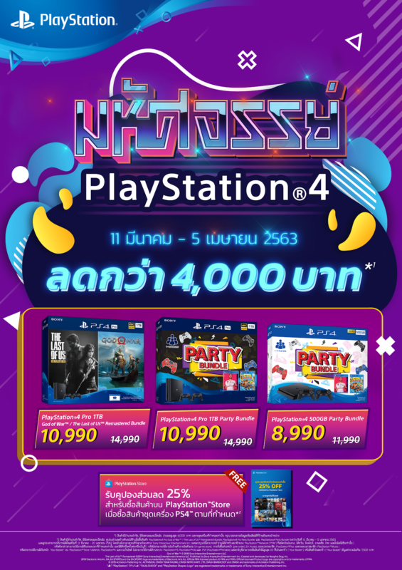 เริ่มตั้งแต่วันที่ 11 มีนาคม 2562 – วันที่ 5 เมษายน 2563 ลูกค้าสามารถซื้อผลิตภัณฑ์ต่าง ๆ ของ PlayStation® ตามรายละเอียดด้านล่างผ่านทางร้านตัวแทนจำหน่ายของ PlayStation หรือ Sony Store และร้านค้าตัวแทนจำหน่ายชั้นนำในราคาสุดพิเศษ