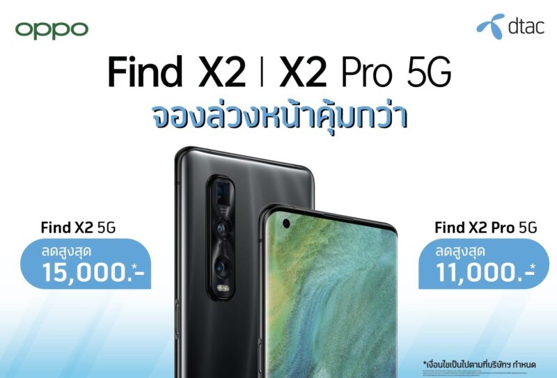 พบกับข้อเสนอพิเศษจากดีแทค มอบส่วนลดสูงสุดถึง 13,000 บาท ราคาเริ่มเพียง 20,990 บาท สำหรับลูกค้า ดีแทค แพลตตินั่มบลูเมมเบอร์ (Platinum Blue Member) รับส่วนลดค่าเครื่องเพิ่ม 2,000 บาท เหลือเพียง 18,990 บาท เมื่อสั่งซื้อ OPPO Find X2 5G ล่วงหน้า และรับส่วนลดสูงสุดถึง 9,000 บาทราคาเริ่มเพียง 31,990 บาท สำหรับลูกค้าดีแทค แพลตตินั่มบลูเมมเบอร์ (Platinum Blue Member) รับส่วนลดค่าเครื่องเพิ่ม 2,000 บาท เหลือเพียง 29,990 บาท เมื่อสั่งซื้อ OPPO Find X2 Pro 5G ล่วงหน้าและสำหรับลูกค้าดีแทคที่มีอายุการใช้งาน 12 เดือนขึ้นไป ไม่ต้องชำระค่าบริการล่วงหน้า ลูกค้าย้ายค่ายเบอร์เดิม รับส่วนลดเพิ่มได้อีก 1,500 บาทพิเศษสุด! ลูกค้าสามารถผ่อน 0% นานสูงสุด 36 เดือน ได้ที่สำนักงานดีแทค โดยรายละเอียดเป็นไปตามที่บริษัทฯกำหนด นอกจากนี้ลูกค้าที่ทำการสั่ง