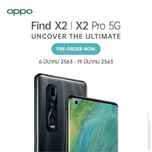 กลับมาอีกครั้งกับ OPPO Find X2 Series 5G สมาร์ทโฟนที่รวมสุดยอดนวัตกรรมไว้ในเครื่องเดียว โดยได้ทำการเปิดตัวไปเมื่อวันที่ 6 มีนาคม 2563 แบบออนไลน์ครั้งแรกในประเทศไทย ซึ่งในซีรีส์นี้มีสองรุ่นด้วยกัน ได้แก่ OPPO Find X2 5G โดยมีราคาเปิดตัวที่ 33,990 บาท และ OPPO Find X2 Pro 5G มีราคาเปิดตัวที่ 40,990 บาท พร้อมวางจำหน่ายอย่างเป็นทางการวันที่ 20 มีนาคมนี้ ณ OPPO Brand Shop ทุกสาขา และตัวแทนจำหน่ายทั่วประเทศ