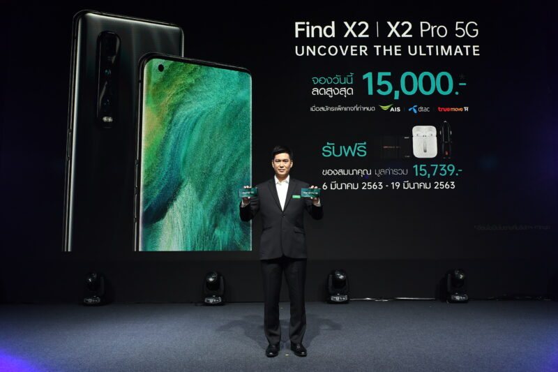 OPPO Find X2 Series 5G สุดยอดนวัตกรรมในสมาร์ทโฟนมาด้วยกันสองรุ่น ได้แก่ OPPO Find X2 5G มาในราคา 33,990 บาท และ OPPO Find X2 Pro 5G มาในราคา 40,990 บาท พร้อมเปิดจองแล้ววันนี้ – 19 มีนาคมนี้ พร้อมรับข้อเสนอพิเศษ กับส่วนลดสูงสุดถึง 15,000 บาท เมื่อซื้อพร้อมแพ็คเกจกับผู้ให้บริการเครือข่าย สำหรับผู้ที่ทำการซื้อ OPPO Find X2 Series 5G ทั้งรุ่น OPPO Find X2 5G และ OPPO Find X2 Pro 5G รับฟรีของสมนาคุณมูลค่ารวม 15,739 บาท ประกอบด้วย OPPO Enco Free True Wireless Headphones, 50W SuperVOOC Car Charger และ VIP Card