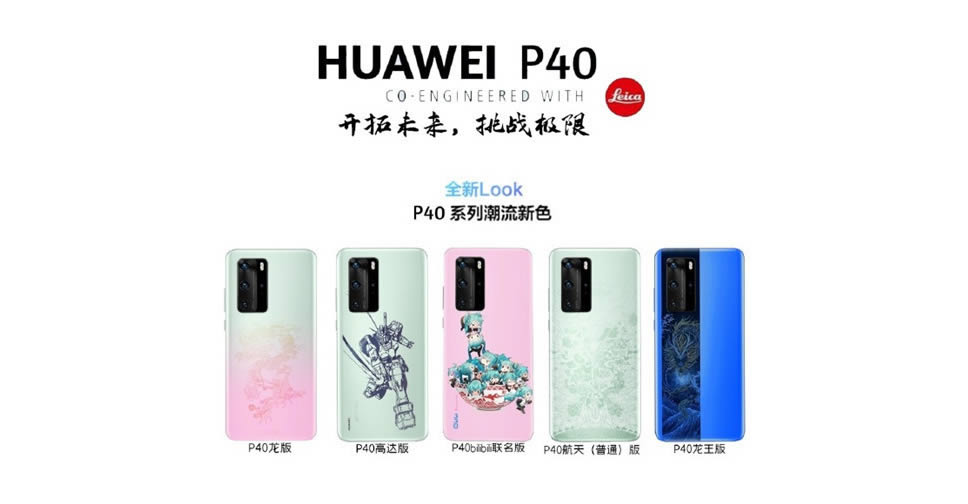 แหล่งข่าวในประเทศจีน แชร์ภาพหลุด Huawei P40 series รุ่นพิเศษ ที่มีให้เลือกอย่างน้อย 8 ลาย อย่างเช่น Dragon Edition, Gundam Edition และ Aerospace Edition แต่ละลายวางจำหน่ายในราคาแตกต่างกัน ตามความจำภายใน