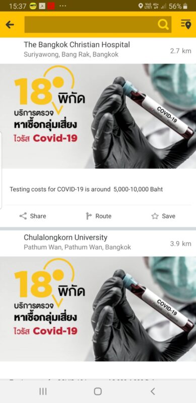 นอสตร้า แมพ (NOSTRA Map) แอปพลิเคชันแผนที่นำทาง โดยบริษัท โกลบเทค จำกัด ร่วมฝ่าวิกฤติ COVID-19 จัดทำแผนที่พิเศษแสดงตำแหน่งสถานพยาบาลในเขตกรุงเทพ และปริมณฑล ที่มีความพร้อมรับตรวจหาเชื้อไวรัสโคโรนาหรือโรคโควิด-19บริการประชาชน สำหรับประชาชนกลุ่มเสี่ยง โดยสามารถตรวจสอบค่าใช้จ่ายเบื้องต้นของแต่ละโรงพยาบาลเพิ่มเติมได้ในแอพพลิเคชัน