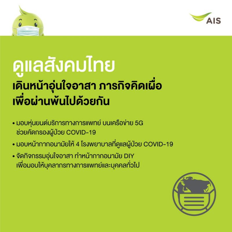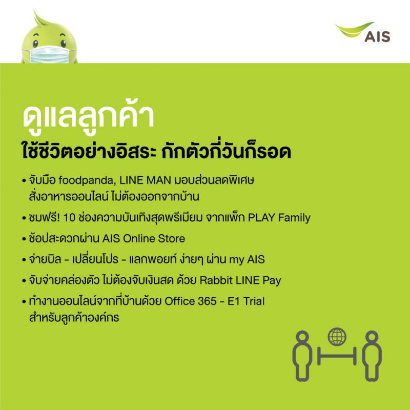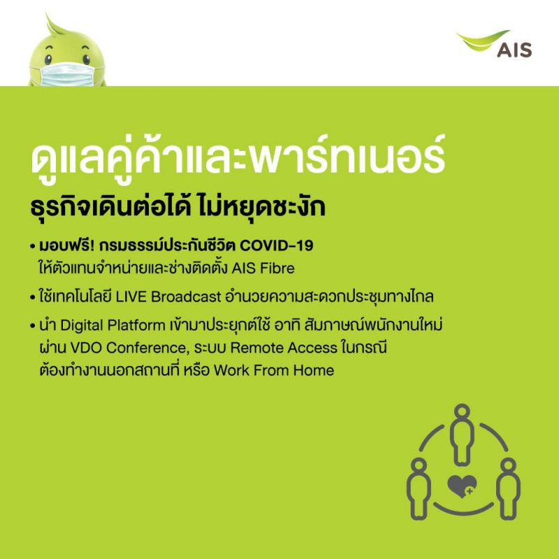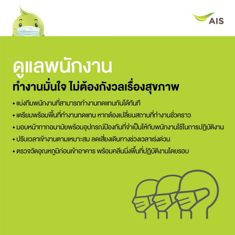 – สำหรับพนักงานที่ให้บริการลูกค้าใน AIS Shop, ร้านเทเลวิซ รวมไปถึงช่างติดตั้ง AIS Fibre จะต้องสวมหน้ากากอนามัยตลอดเวลา พร้อมมีการตรวจวัดไข้วันละ 2 ครั้ง และเพิ่มบริการแอลกอฮอล์เจลสำหรับล้างมือ เพื่อให้บริการลูกค้า รวมถึงการใส่ถุงมือสำหรับพนักงานที่ปฏิบัติงานในบริเวณสนามบิน