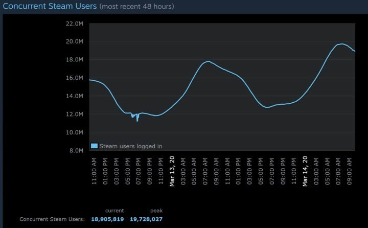 Steam แพลตฟอร์มเกมดิจิตอลสำหรับ PC ถูกทำลายสถิติด้วยจำนวนผู้ใช้งานสูงสุดเกือบ 20 ล้านคน ในวันที่ 14 มีนาคมที่ผ่านมา โดยตัวเลขที่แม่นยำคือ 19,728,027 คน ในช่วงเวลา 7:00 นาฬิกา สำหรับสถิติเดิมของ Steam เคยมีจำนวนผู้ใช้งานในเวลาเดียวกันสูงสุด 18,801,944 ในเดือนกุมภาพันธ์ที่ผ่านมา