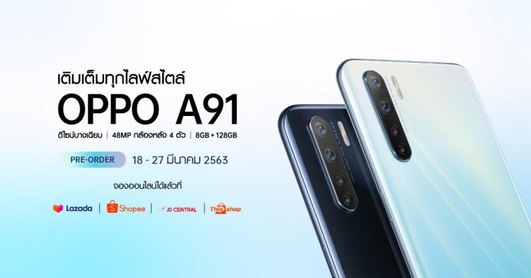 เข้าไทยอย่างเป็นทางการแล้วกับ OPPO A91 สมาร์ทโฟนดีไซน์บางเฉียบ พร้อม 4 กล้องหลัง “เติมเต็มทุกไลฟ์สไตล์” มาพร้อมตัวเครื่องที่บางเพียง 7.9 มม. อัตราส่วนหน้าจอ 20:9 ที่เบาเป็นพิเศษ กล้องสี่ตัวที่มีขนาดกะทัดรัดในดีไซน์เรียบง่าย คมชัดสูงสุด 48 ล้าน ให้ภาพคุณภาพสูง คมชัด ให้รายละเอียดมากขึ้น พร้อม Ultra Wide Angle มุมกว้างพิเศษ 119° และ Night Portrait Mode ถ่ายภาพบุคคลได้แม้แสงน้อย อีกทั้งยังมีระบบชาร์จไว VOOC Flash Charge 3.0 ชาร์จได้ 10% ในเวลาเพียง 5 นาที และ 50% ใน 30 นาที พร้อมแบตเตอรี่ 4,000 mAh, RAM 8GB, ROM 128GB และ MediaTek Helio P70
