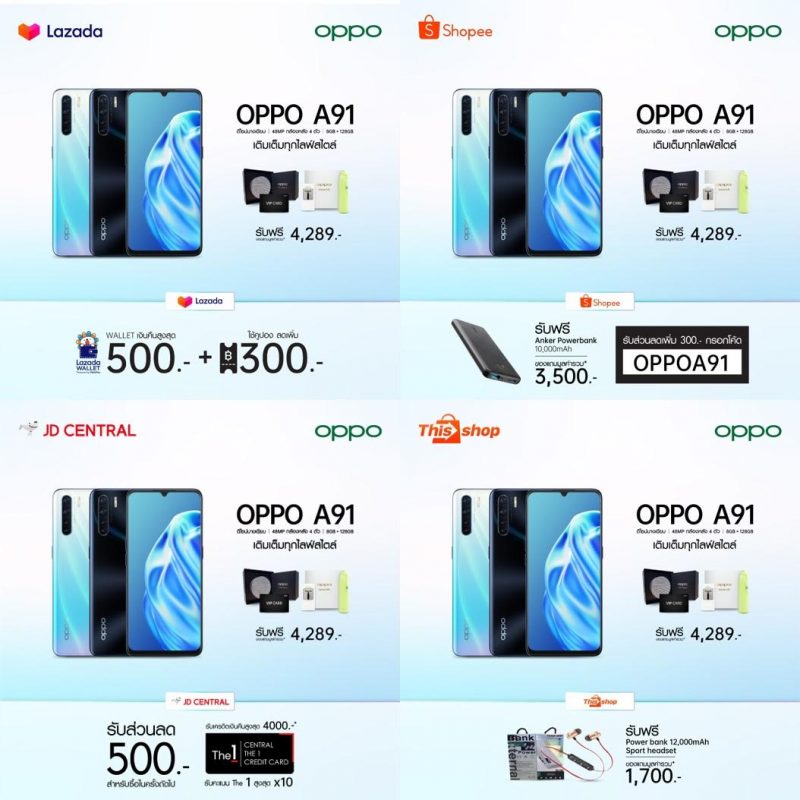 เมื่อพรีออเดอร์ OPPO A91 ผ่านช่องทาง Lazada รับฟรี! Lazada Cashback Wallet สูงสุด 500 บาท สำหรับ 300 ท่านแรก, ในช่องทาง Shopee รับฟรี! Anker Powerbank 10,000 mAh มูลค่า 3,500 บาท และ รับ Shopee Coin Cashback 8% สูงสุด 1,000 coins, สำหรับ JD Central รับคูปองออนไลน์ส่วนลด 500 บาท สำหรับซื้อสินค้าในร้าน OPPO Official Store ครั้งถัดไป พร้อมรับเครดิตเงินคืนรวมสูงสุด 4,000 บาท และรับคะแนนเดอะวันสูงสุด 10 เท่า ผ่านบัตรเครดิต The 1 Card และเมื่อซื้อ OPPO A91 ผ่านช่องทาง Thisshop รับฟรี! Powerbank 12,000 mAh มูลค่า 1,000 บาท และหูฟัง Sport Headset มูลค่า 700 บาท พร้อมรับ TCoin x 2 เพิ่มอีกด้วย