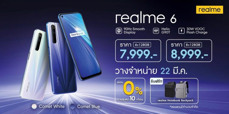 realme 6 วางจำหน่ายพร้อมกันทั่วประเทศในวันที่ 22 มีนาคม สำหรับรุ่นความจุ 4+128GB ในราคาเริ่มต้นที่ 7,999 บาท และรุ่นความจุ 8+128GB ในราคาเริ่มต้นที่ 8,999 บาท พร้อมโปรโมชั่นพิเศษผ่อน 0% นานสูงสุด 10 เดือน และรับฟรีทันที realme Notebook Backpack ของแถมมีจำนวนจำกัด พิเศษสำหรับลูกค้าที่ซื้อผ่าน realme Brand Shop รับฟรี realme notebook backpack , realme neck pillow , VIP Card , Membership Card พร้อมผ่อน 0% นานสูงสุด 10 เดือน นอกจากนี้ยังสามารถจับจองได้ผ่านตัวแทนจำหน่ายทั่วประเทศ