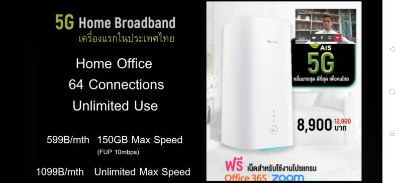 • ครั้งแรกกับ 5G Home Broadband ด้วยอุปกรณ์เราเตอร์กระจายสัญญาณรุ่นใหม่ที่รองรับทั้งเครือข่าย 5G และ 4G ในราคาพิเศษ 8,900 บาท (จากปกติ 12,900 บาท) พร้อมสมัครแพ็กเกจรายเดือนเพียง 599 บาท (นาน 12 เดือน) รับสิทธิ์ใช้เน็ต 5G ความเร็วสูงสุด 50 GB และ 4G ความเร็วสูงสุด 100 GB จากนั้นใช้เน็ตต่อเนื่องไม่อั้นที่ความเร็ว 10 Mbps พร้อมใช้งาน Office 365 และแอป Zoom Video Conferencing ไม่อั้น นาน 3 เดือน สมัครได้แล้วตั้งแต่วันนี้ – 30 มิถุนายน 2563 และสามารถใช้งานแพ็กได้ต่อเนื่อง นาน 1 ปี นับจากวันที่สมัคร