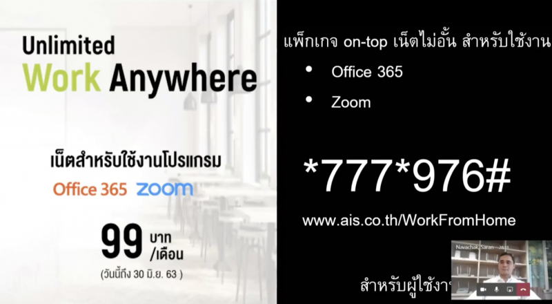 • แพ็กเกจ Unlimited Work Anywhere ใช้งานเน็ตบน Microsoft office 365 และแอป Zoom Video Conferencing ไม่อั้น เพียง 99 บาทต่อเดือน สมัครได้แล้วตั้งแต่วันนี้ – 30 มิถุนายน 2563 และสามารถใช้งานแพ็กได้ต่อเนื่อง 3 เดือน นับจากวันที่สมัคร (ทั้งนี้ ค่าบริการของแพ็กเกจนี้ ไม่รวมค่าไลเซนส์ในการใช้งาน Office 365 และ Zoom Video Conferencing)