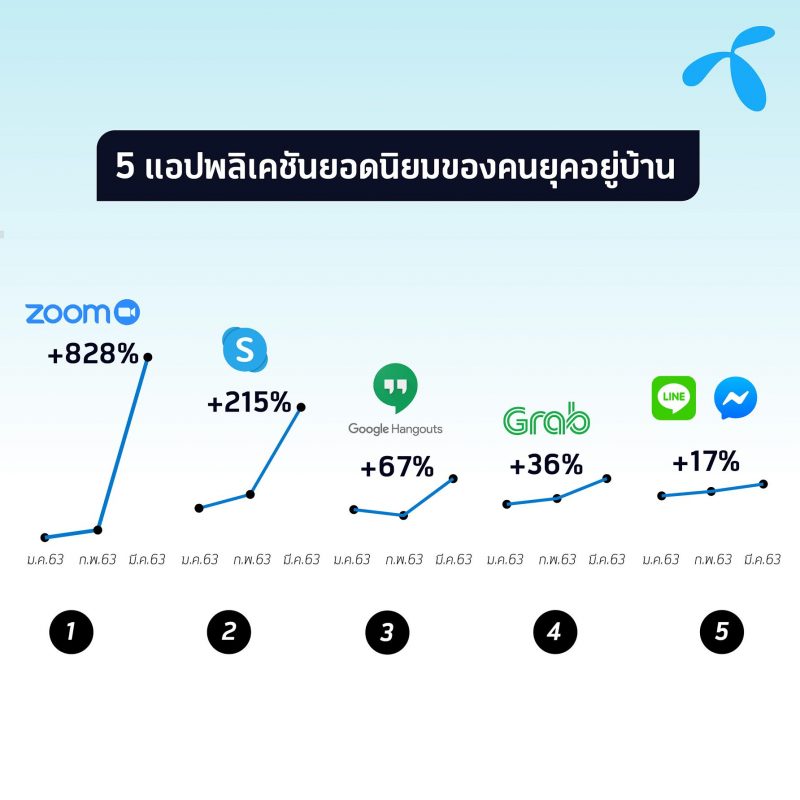 รายงานจากดีแทคพบว่าผู้ใช้งานจากฐานลูกค้ารวมในไตรมาสแรก (1 มกราคม-19 มีนาคม 2563) ให้ความสำคัญกับแอปพลิเคชันรองรับการทำงานจากบ้านเพื่อรับวิกฤตโควิด-19 โดยแอปพลิเคชันที่เติบโตสูงสุด 5 อันดับมี ดังนี้