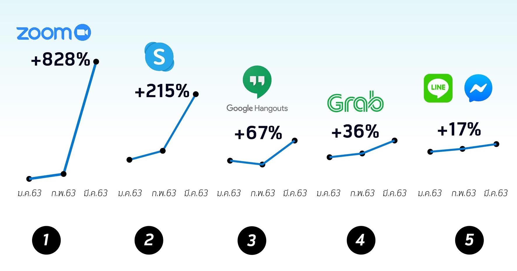 อันดับ 5 คือ แอปพลิเคชัน Facebook Messenger และ LINE Call (VoIP) ผู้ใช้งานเพิ่มขึ้น 17%
