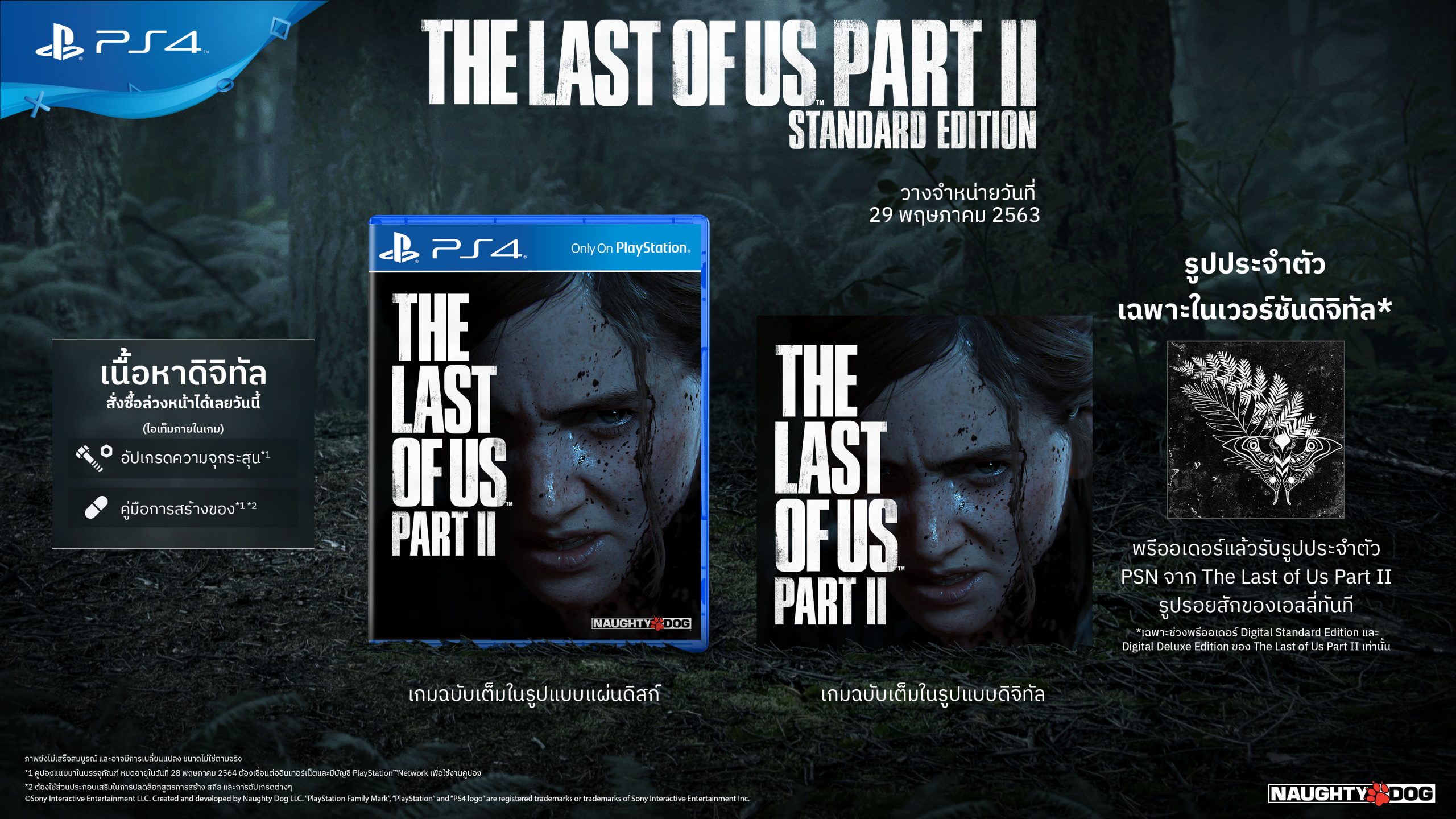 โซนี่ อินเตอร์แอคทีฟ เอนเตอร์เทนเมนต์ สิงคโปร์ ประกาศวันวางจำหน่ายเกมเอ็กซ์คลูซีฟ “The Last of Us™ Part II” บนเครื่องเกม PlayStation®4 (PS4™) ในวันที่ 29 พฤษภาคม ศกนี้ มาพร้อมฟีเจอร์รองรับภาษาไทย ประกอบด้วยรูปแบบดิจิทัลดาวน์โหลด Digital Standard Edition ราคา 1,890 บาท และ Digital Deluxe Edition ราคา 2,390 บาท และรูปแบบแผ่นบลูเรย์ Standard Edition ราคา 1,890 บาท, Special Edition ราคา 2,590 บาท, Collector’s Edition ราคา 6,690 บาท และ Ellie Edition ราคา 8,990 บาท