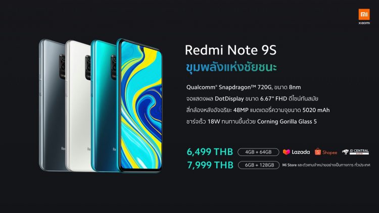 1. Redmi Note 9S ความจุ 4GB + 64GB จะจำหน่ายในราคา 5,999 บาท จากราคา 6,499 บาท พิเศษพร้อมรับ Mi Smart Band 4 ฟรี มูลค่า 1,299 บาท