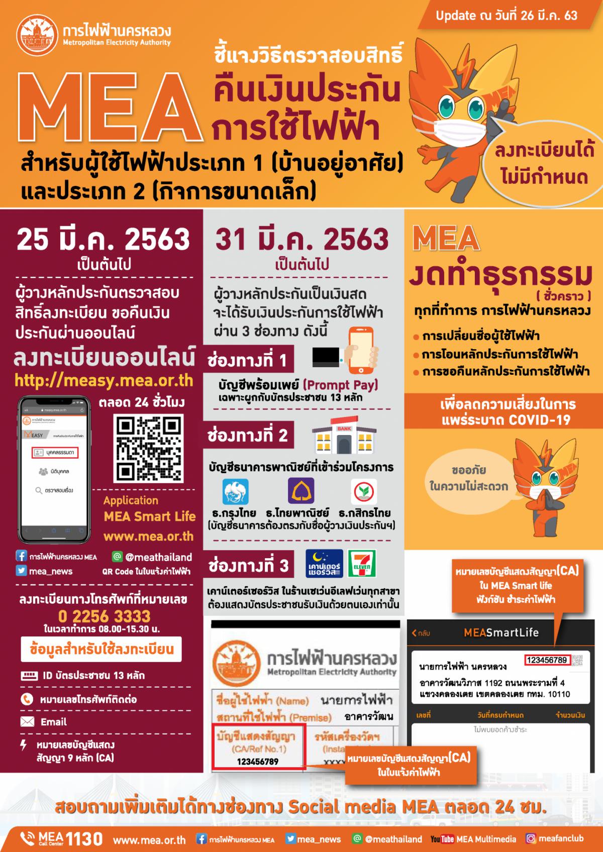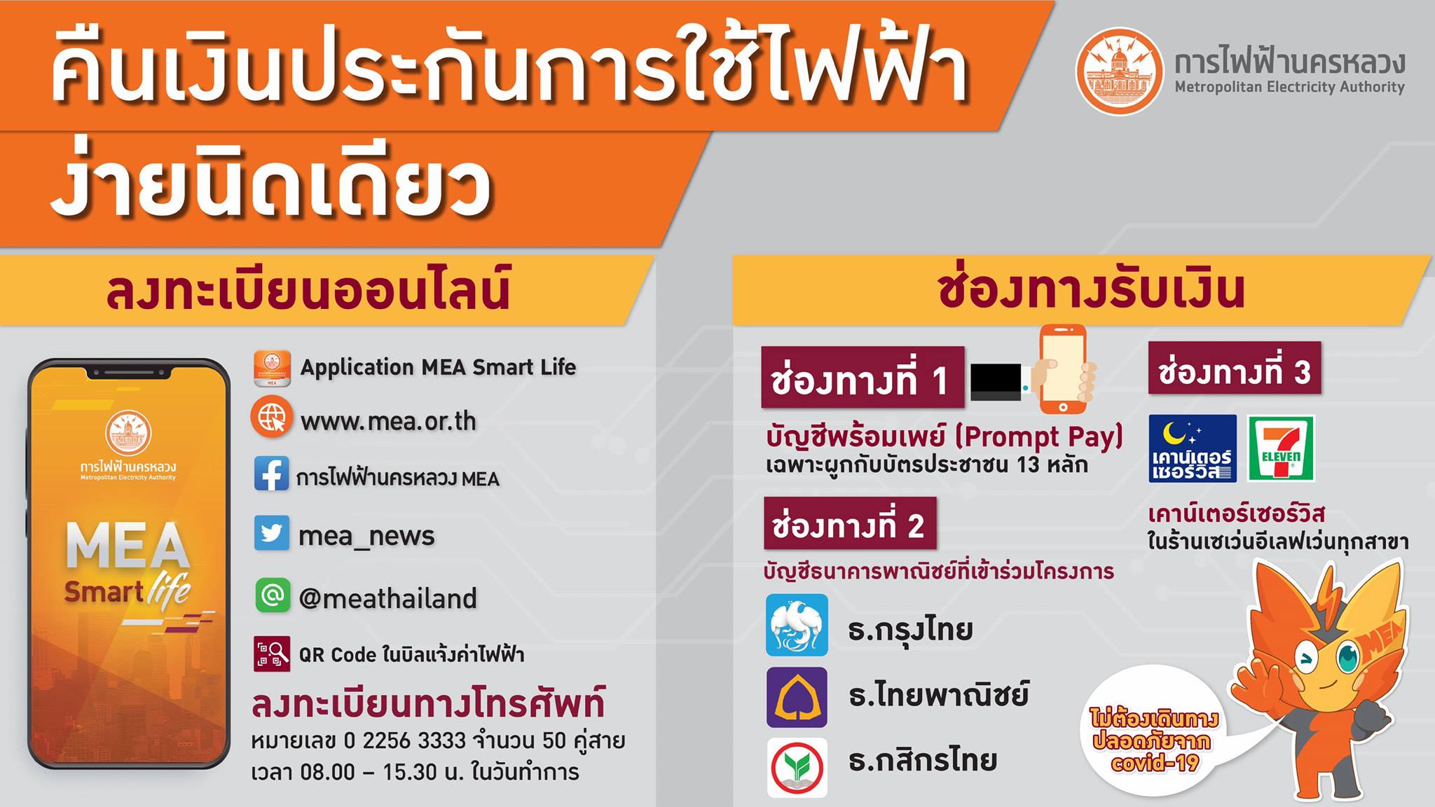 โฆษก MEA กล่าวต่อไปว่า นอกจากช่องทางการลงทะเบียนผ่านระบบออนไลน์ http://measy.mea.or.th แล้ว ผู้ขอคืนเงินประกันการใช้ไฟฟ้ายังสามารถติดต่อลงทะเบียนผ่านช่องทางโทรศัพท์หมายเลข 0 2256 3333 (เฉพาะพื้นที่กรุงเทพมหานคร นนทบุรี และสมุทรปราการ) โดยสามารถเลือกรับเงินคืนได้ผ่านบัญชีพร้อมเพย์ (เฉพาะบัญชีที่ผูกกับหมายเลขบัตรประชาชน) หรือโอนเข้าบัญชี ธ.กรุงไทย ธ.ไทยพาณิชย์ ธ.กสิกรไทย และ ธ.กรุงเทพฯ(เฉพาะชื่อบัญชีของเจ้าของหลักประกัน) หรือเลือกรับเงินสดได้ที่เคาน์เตอร์เซอร์วิส ในร้านเซเว่นอีเลฟเว่นทุกสาขา (รับเงินสดด้วยตนเองพร้อมแสดงบัตรประชาชน)