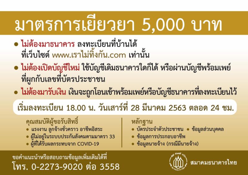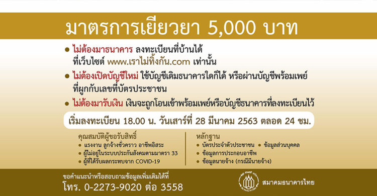 ต้องเป็นผู้ได้รับผลกระทบจากการแพร่ระบาดของโควิด-19 ซึ่งเปิดลงทะเบียนที่ www.เราไม่ทิ้งกัน.com วันที่ 28 มี.ค.63 เวลา 18.00 น.ตลอด 24ชั่วโมง โดยไม่ต้องยื่นเอกสารใดๆ แต่ต้องเขียนรายละเอียดถึงอาชีพและผลกระทบที่เกิดขึ้นอย่างชัดเจน ผู้ที่จะลงทะเบียนไม่ต้องเดินทางไปที่ธนาคาร ให้รอลงทะเบียนออนไลน์เท่านั้น