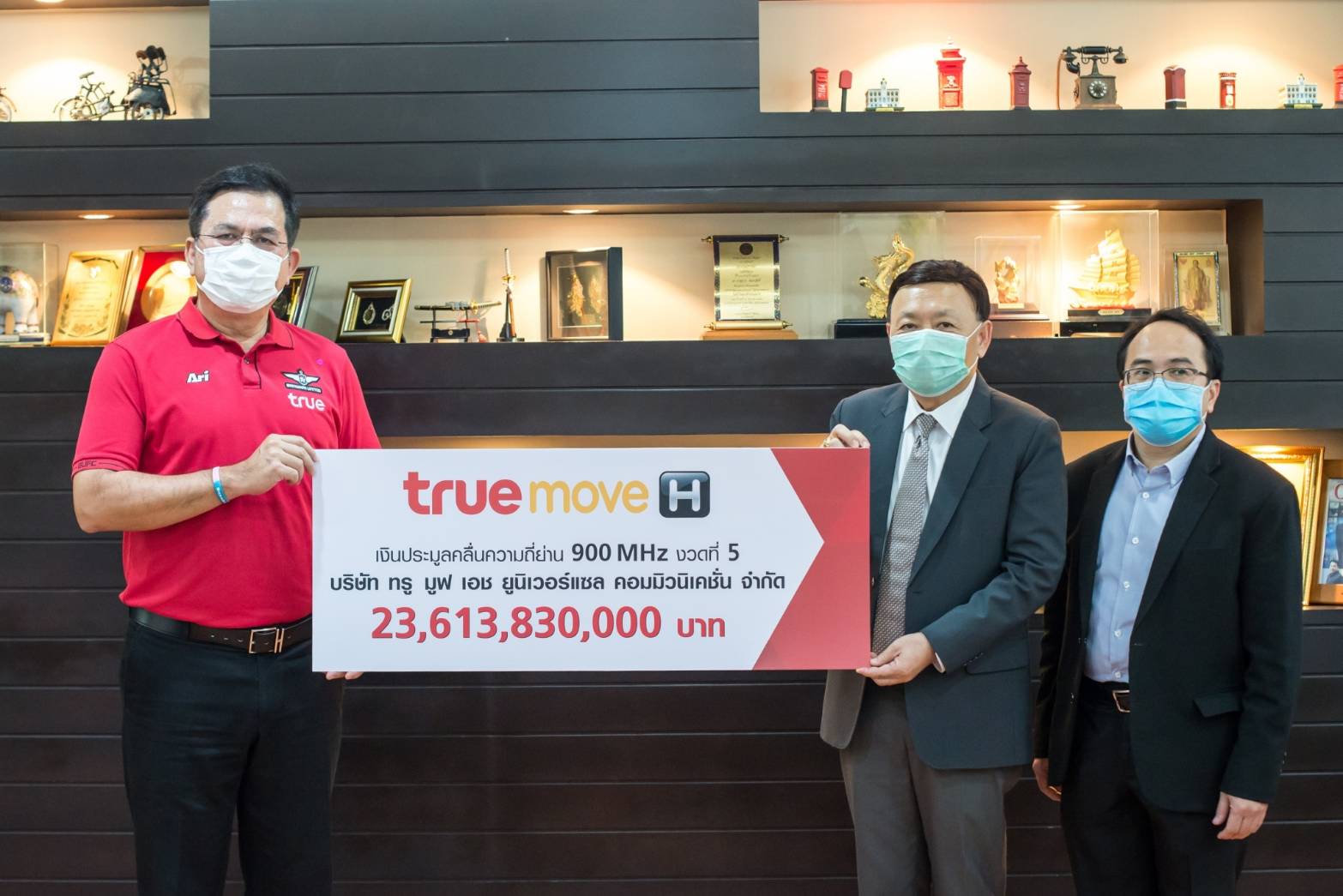 สำนักงานคณะกรรมการกิจการกระจายเสียง กิจการโทรทัศน์ และกิจการโทรคมนาคมแห่งชาติ โดย นายฐากร ตัณฑสิทธิ์ เลขาธิการ พร้อมด้วย นายสุทธิศักดิ์ ตันตะโยธิน รักษาการรองเลขาธิการสายงานกิจการโทรคมนาคม ร่วมรับมอบเงินค่าประมูลคลื่นความถี่สำหรับกิจการโทรคมนาคมย่าน 900 เมกกะเฮิรตซ์ คลื่นความถี่ 905 – 915 MHz / 950 – 960 MHz งวดที่ 5 จาก บริษัท ทรูมูฟ เอช ยูนิเวอร์แซล คอมมิวนิเคชั่น จำกัด โดยนายจักรกฤษณ์ อุไรรัตน์ รองผู้อำนวยการด้านรัฐกิจสัมพันธ์ บมจ.ทรู คอร์ปอเรชั่น จำนวน 23,613.83 ล้านบาท (รวมภาษีมูลค่าเพิ่มแล้ว) พร้อมกับหนังสือค้ำประกันจากสถาบันการเงินเพื่อค้ำประกันการชำระเงินประมูลคลื่นความถี่ในงวดที่ 6-10 จำนวน 40,819.43 ล้านบาทตามเงื่อนไขของการชำระเงินประมูล