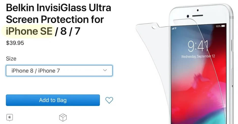 หลักฐานแรกเป็น InvisiGlass Ultra Screen Protector ของ Belkin ที่ออกแบบมาสำหรับ iPhone 7 และ iPhone 8 ได้มีการปรับปรุงข้อมูลใหม่ โดยเพิ่มการรองรับ iPhone SE เข้าไปด้วย