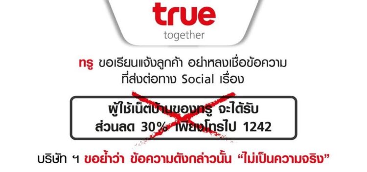 ทรู ขอเรียนแจ้งลูกค้า อย่าหลงเชื่อข้อความที่ส่งต่อทางSocial เรื่องผู้ใช้เน็ตบ้านของทรูจะได้รับส่วนลด 30% เพียงโทรไป 1242 บริษัท ฯ ขอย้ำว่า ข้อความดังกล่าวนั้น “ไม่เป็นความจริง “ ทั้งนี้ ขอเรียนแจ้งว่า นโยบายของกลุ่มทรู ที่ช่วยดูแลลูกค้าในช่วงสถานการณ์ วิกฤต โควิด-19 ขณะนี้ มีดังนี้