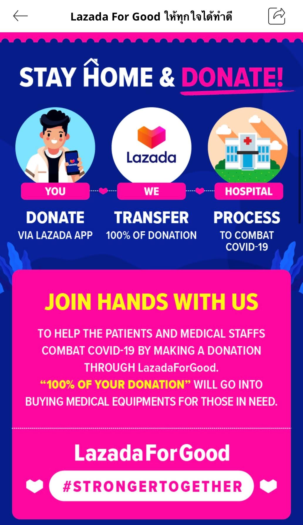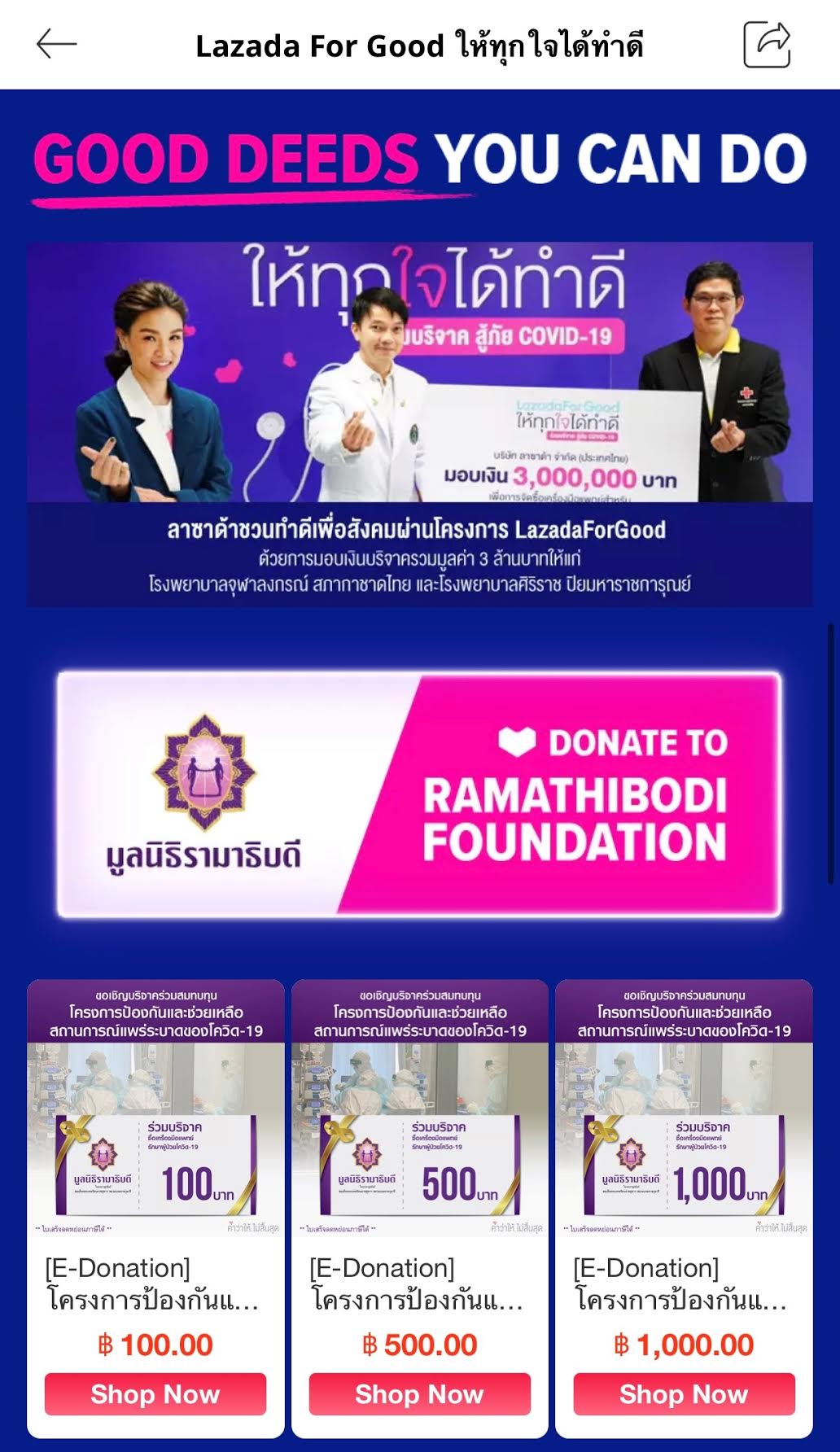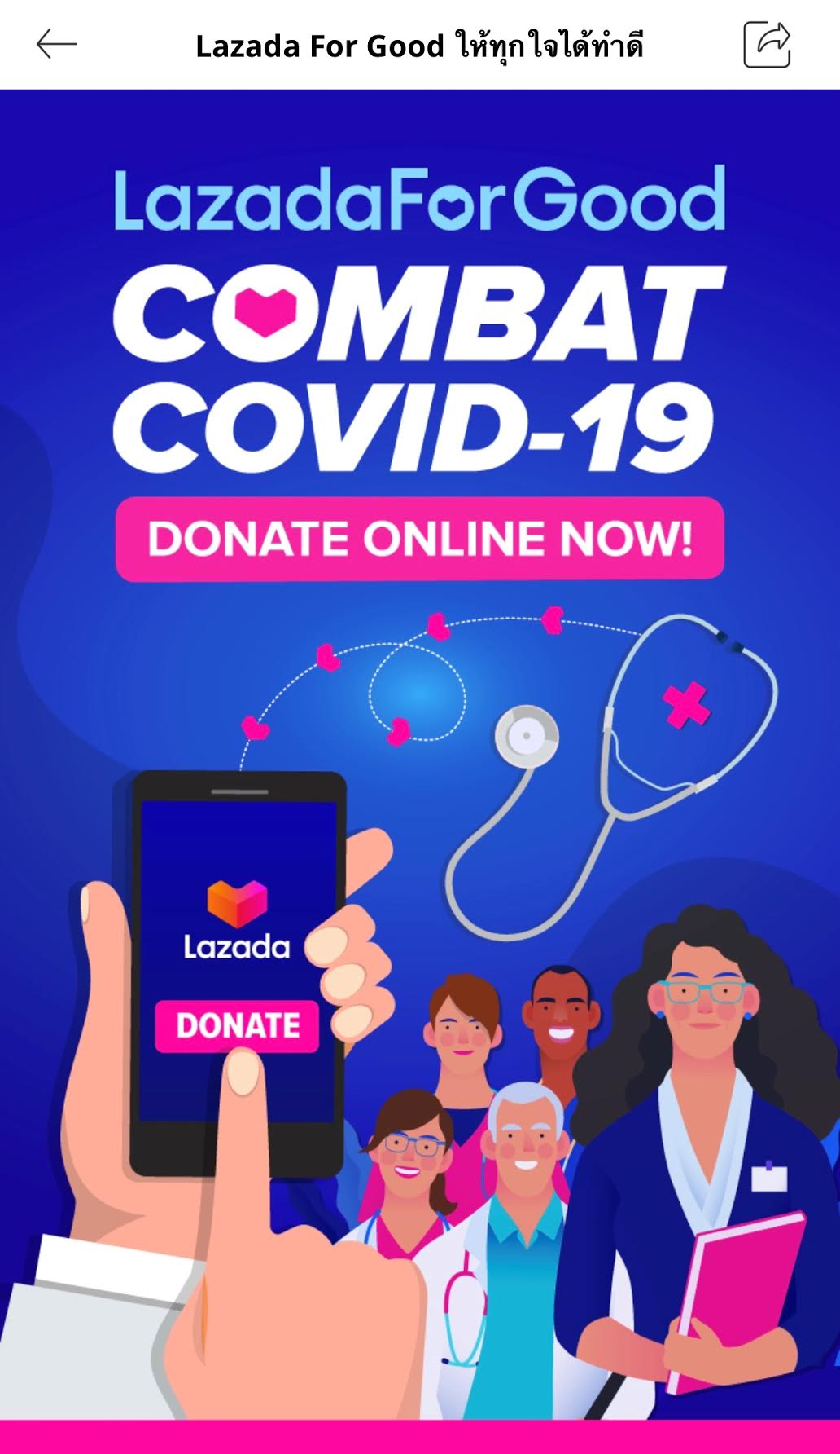 ลาซาด้า ประเทศไทย เปิดตัวโครงการ “LazadaForGood ให้ทุกใจได้ทำดี” ช่องทางการบริจาคออนไลน์เพื่อสนับสนุนองค์กรไม่แสวงหาผลกำไร พร้อมมอบเงินบริจาครวม 3 ล้านบาทแก่โรงพยาบาล ทั้งหมดนี้มีจุดประสงค์เพื่อสนับสนุนบุคลากรทางการแพทย์และสาธารณสุขในการต่อสู้กับไวรัสโควิด-19