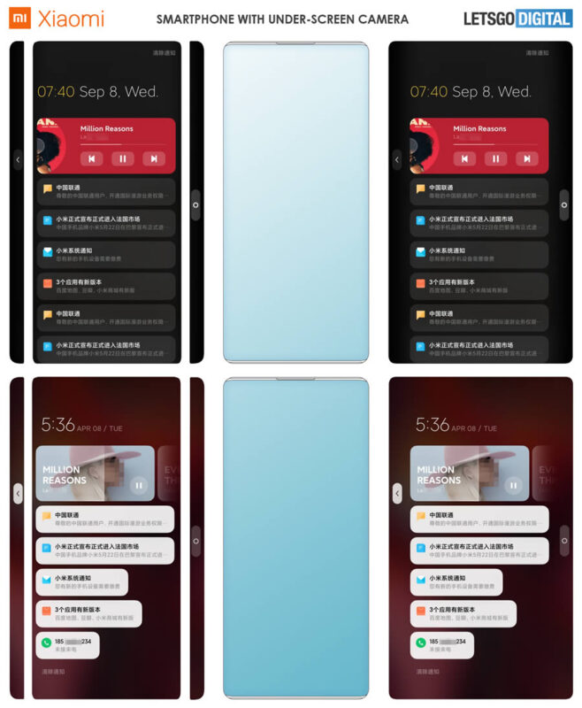 การออกแบบในสิทธิบัตรแสดงให้เห็นพื้นที่จอแสดงผลครอบคลุมเกือบเต็มพื้นที่มีส่วนขอบบนกับขอบล่างที่บางเฉียบ จึงไม่มีพื้นที่พอให้ติดตั้งกล้องเซลฟี่ และไม่มีการทำหลุมหรือเจาะรูเผื่อไว้ จึงเป็นไปได้ที่ Xiaomi จะนำเทคโนโลยีซ่อนกล้องเซลฟี่ไว้ใต้หน้าจอมาใช้งาน ซึ่งเคยเปิดเผยต้นแบบมาแล้วในปีที่ผ่านมา