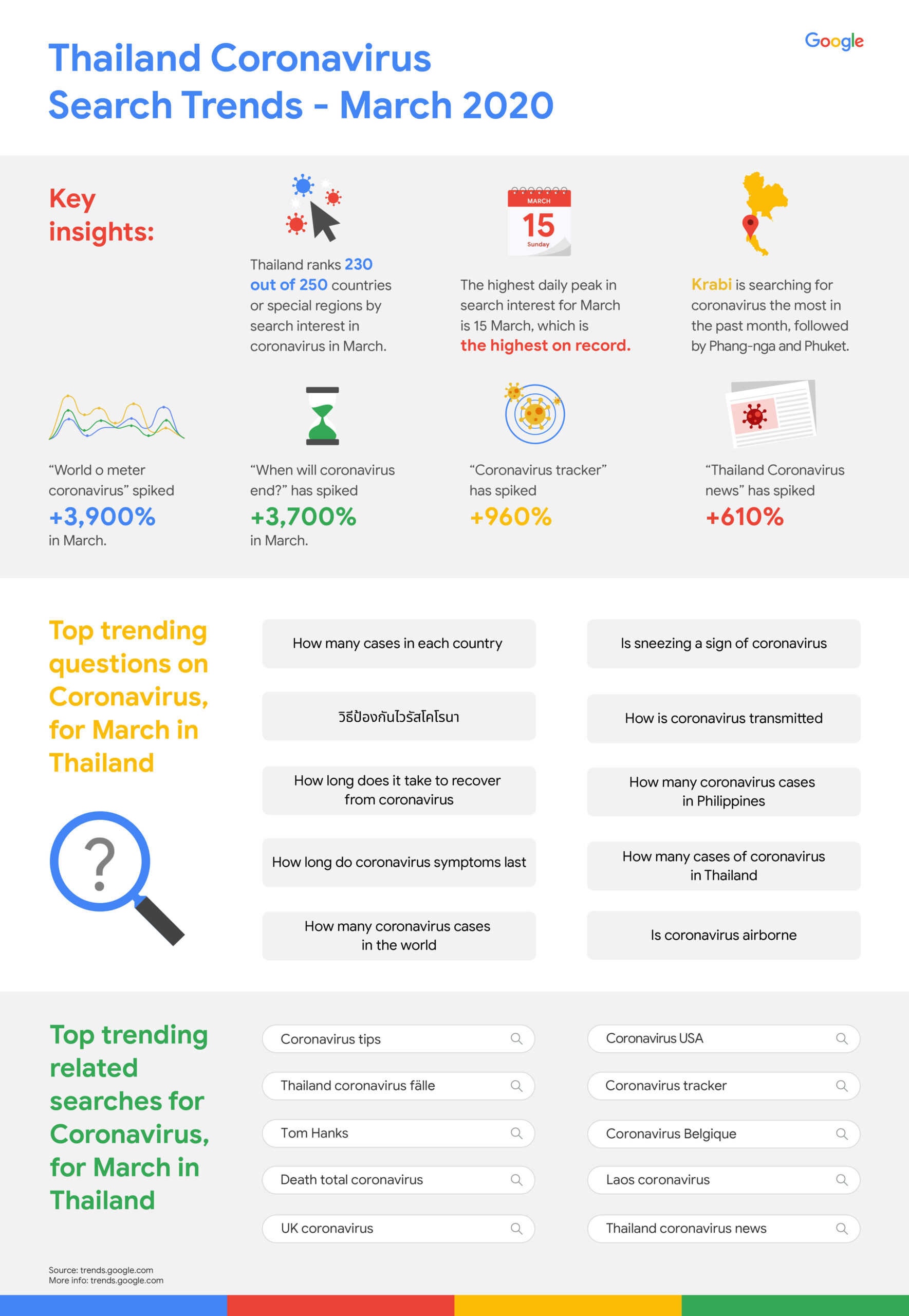 Google เผยคำค้นหายอดนิยมและคำถามที่ได้รับความสนใจเกี่ยวกับโรคติดเชื้อไวรัสโคโรนา 2019 ในประเทศไทยช่วงเดือนมีนาคมที่ผ่านมา ด้วยการนำเสนอข้อมูลเชิงลึกที่สำคัญ