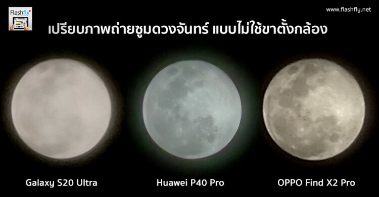 คืนนี้ 8 เมษายน 2563 เป็นเป็นคืนที่ดวงจันทร์จะมีขนาดใหญ่ที่สุดหรือที่เรียกว่า Super Full Moon ดวงจันทร์จะโคจรใกล้โลกที่สุดในรอบปี ตั้งแต่เวลา 19.00 น. สามารถเห็นได้ตาเปล่าทั่วประเทศอีกด้วย ทีมงาน @flashfly ไม่รอช้ารีบนำสมาร์ทโฟน 3 รุ่นดังที่ได้รับความนิยมอย่างมากในบ้านเราได้แก่ Samsung Galaxy S20 Ultra ,Huawei P40 Pro และ OPPO Find X2 Pro มาทดสอบเปรียบเทียบถ่ายภาพซูมดวงจันทร์แบบเต็มสเปกโดยด้วยมือถือเปล่าๆแล้วกด โดยไม่ใช้ขาตั้งกล้องแต่อย่างใดมาดูกันว่าผลที่ได้จะเป็นอย่างไรบ้าง