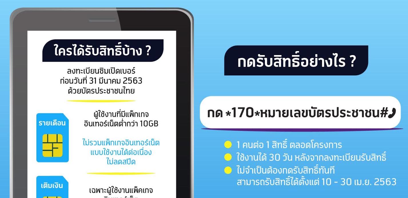 ลูกค้าดีแทคทั้งโพสต์เพดและพรีเพด จะได้รับสิทธิ์อินเทอร์เน็ตฟรี 10GB กดรับสิทธิ์เริ่มวันที่ 10 – 30 เมษายน นาน 30 วัน โดยการกด *170* เลขบัตรประชาชน # โทรออก ด้วยขั้นตอนและเงื่อนไข ดังนี้
