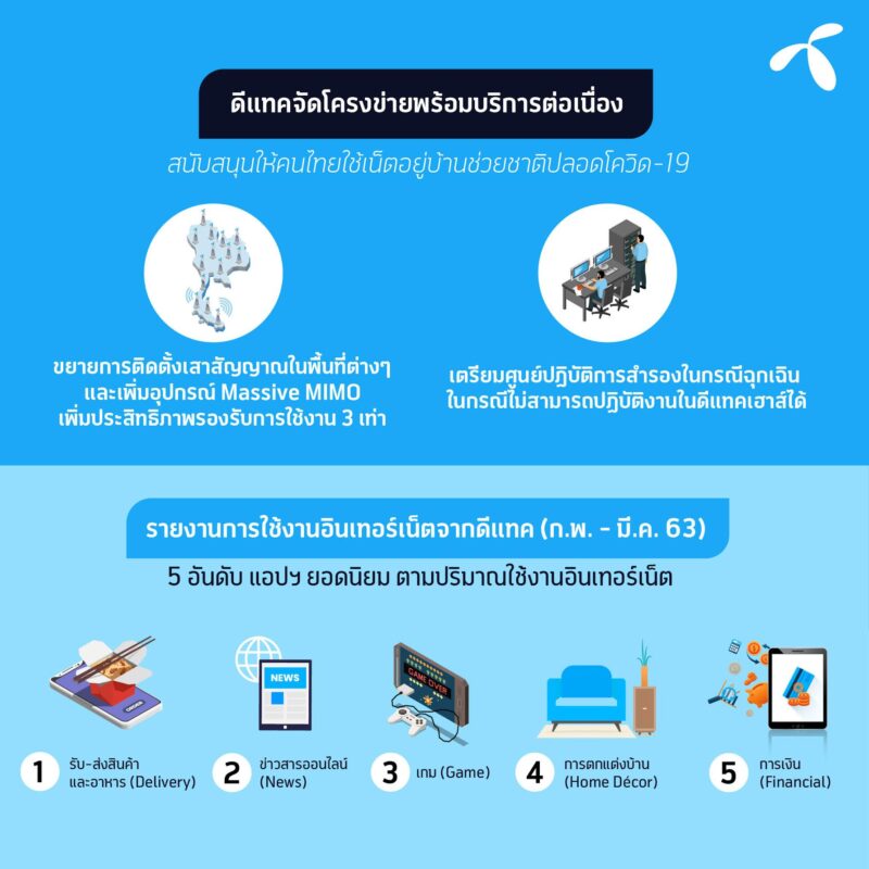 นายประเทศ ตันกุรานันท์ รองประธานเจ้าหน้าที่บริหารกลุ่มเทคโนโลยี บริษัท โทเทิ่ล แอ็คเซ็ส คอมมูนิเคชั่น จำกัด (มหาชน) หรือดีแทค กล่าวว่า “นอกจากดีแทคได้สนับสนุนให้คนทำงานผ่านอินเทอร์เน็ตที่บ้าน หรืออยู่บ้านด้วยการมอบฟรีอินเทอร์เน็ต 10 GB ตามที่ดีแทคได้ร่วมมือกับกสทช. แล้ว ดีแทคยังได้เตรียมความพร้อมของโครงข่ายเพื่อรองรับกับพฤติกรรมที่พวกเราต้องใช้ชีวิตอยู่ในที่พักอาศัย โดยเราต้องไม่ขาดการติดต่อสื่อสารกัน และเพลิดเพลินกับกิจกรรมบนโลกออนไลน์ ดีแทคจึงจัดทีมงานมอนิเตอร์การใช้งานตลอด 24 ชั่วโมง เพื่อปรับการให้บริการตามพฤติกรรมใช้งานของลูกค้าให้เหมาะสมอย่างต่อเนื่อง ทีมงานดูแลโครงข่ายของดีแทคยังปฏิบัติงาน 24 ชั่วโมง ไม่มีวันหยุด พร้อมทั้งได้ขยายการติดตั้งเสาสัญญาณในพื้นที่ต่างๆ และเพิ่มอุปกรณ์ Massive MIMO เพิ่มประสิทธิภาพรองรับการใช้งาน 3 เท่า เรายืนยันในความพร้อมทุกสถานการณ์เพื่อลูกค้าของเราต้องใช้งานได้ต่อเนื่อง อยู่ที่บ้านช่วยชาติปลอดโควิด-19 ได้อย่างสบายใจและต้องได้รับผลกระทบน้อยที่สุดในยามวิกฤต”