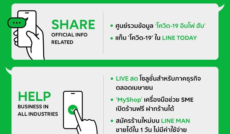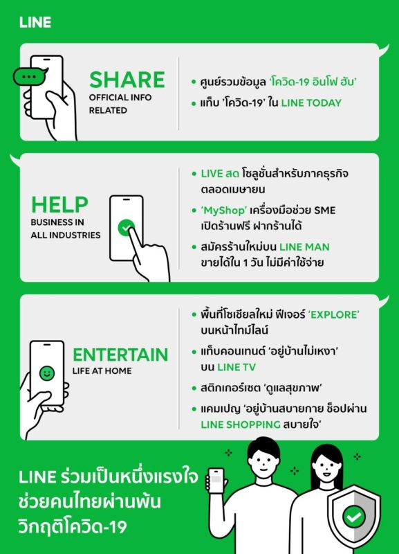 LINE ประเทศไทย ภายใต้พันธกิจ “Closing the distance” เร่งเพิ่มการพัฒนาแพลตฟอร์มและโซลูชัน เพื่อส่งแรงใจช่วยคนไทยทั้งในระดับบุคคลและธุรกิจให้ปรับตัว ปรับแนวคิด สามารถพลิกวิกฤติให้เป็นโอกาสในสถานการณ์การระบาดของโควิด-19 โดยเฉพาะช่วง Social Distancing หรือ ‘การเว้นระยะห่างทางสังคม’ ผ่าน 3 มาตรการ ได้แก่ SHARE – HELP – ENTERTAIN