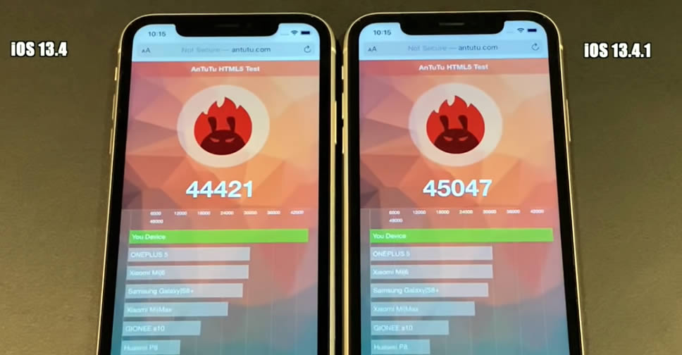 iPhone เครื่องซ้ายมืองานบน iOS 13.4 และ เครื่องขวามือซึ่งเป็น iPhone รุ่นเดียวกัน แต่ทำงานบน 13.4.1 ทั้งคู่จะถูกใช้งานฟีเจอร์หรือแอพเดียวกัน เพื่อให้เห็นความแตกต่างกันอย่างชัดเจน แต่ iOS เวอร์ชั่นใดจะเร็วกว่ากัน ตัดสินได้จากคลิปวีดีโอด้านล่าง