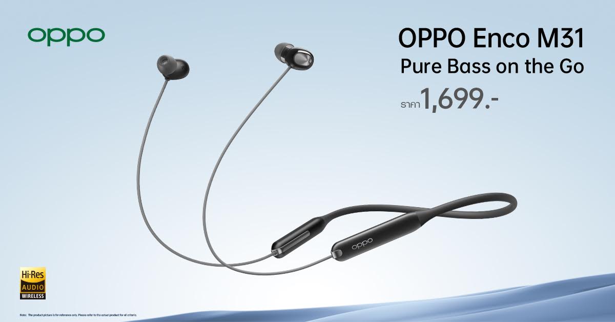 โดย OPPO Enco M31 Wireless Headphones มาพร้อมกับสโลแกน “Pure Bass on the Go” หูฟังไร้สาย เบสชัด เบาสบาย ในราคาสุดคุ้ม อีกทั้งยังได้รับการรับรองว่าสามารถฟังเสียงคุณภาพ Hi-Res Wireless ได้ โดยมอบเสียงที่คมชัด คุณภาพสูง พร้อมดีไซน์อันเป็นเอกลักษณ์ ที่ออกแบบตามหลักสรีรศาสตร์และน้ำหนักเบา ให้คุณสวมใส่สบายตลอดทั้งวัน สำหรับการใช้งานหูฟัง OPPO Enco M31 สามารถกันน้ำ กันเหงื่อได้ในระดับ IPX5 และสามารถตัดเสียงรบกวนรอบข้างได้ด้วย AI ให้คุณได้ยินเสียงอย่างชัดเจนในระหว่างการโทร พร้อมฟังเพลงได้ยาวนานถึง 12 ชั่วโมง และรองรับการชาร์จอย่างรวดเร็ว โดยเมื่อชาร์จ 10 นาที สามารถฟังเสียงความละเอียดสูงได้ถึง 3 ชั่วโมง