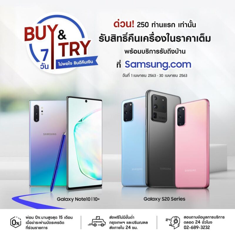 ซัมซุง ใจดี จัดแคมเปญเอาใจช่วง อยู่บ้านหยุดเชื้อช่วยชาติ  “Buy & Try” แคมเปญที่จัดให้ลูกค้าซื้อเครื่องไปก่อน แล้วให้ลองใช้ 7 วัน หากไม่พอใจสามารถรับสิทธิ์คืนเครื่อง คืนเงินภายใน 7 วัน โดยซัมซุงจะมารับเครื่องคืนถึงหน้าบ้าน เมื่อสั่งซื้อ Samsung Galaxy Note 10, Note 10+, S20, S20+ หรือ S20 Ultra 5G ตั้งแต่วันนี้ – 30 เม.ย. 63 ผ่าน Samsung.com (https://shop.samsung.com/th/) เฉพาะ 250 ท่านแรกเท่านั้น!!