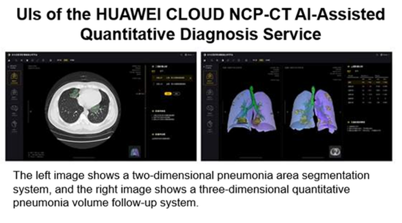 สำหรับโซลูชันผู้ช่วย AI บนเทคโนโลยีของ HUAWEI CLOUD ดังกล่าว เกิดจากการพัฒนาร่วมกันระหว่างหัวเว่ยและเอชวายเมดิคัล (HY Medical) ซึ่งเป็นบริษัทในประเทศจีนที่เชี่ยวชาญด้านการใช้ระบบปัญญาประดิษฐ์เพื่อการแพทย์ ที่มุ่งเน้นการวิเคราะห์รูปภาพทางการแพทย์โดยปัญญาประดิษฐ์ โดยผสานคอมพิวเตอร์วิทัศน์เข้ากับการเรียนรู้เชิงลึก เทคโนโลยีดังกล่าวจะใช้คอมพิวเตอร์วิทัศน์และการวิเคราะห์รูปภาพทางการแพทย์เพื่อแยกแยะระหว่างจุดขาวพร่าในปอด (ground glass opacities – GGOs) จำนวนมาก กับการรวมตัวกันของเนื้อปอด (consolidation) แล้ววิเคราะห์ผลเชิงปริมาณจากผลการตรวจ CT ปอดผู้ป่วย สามารถวิเคราะห์ผลได้ภายในเวลาเพียง 25 วินาทีต่อ 1 เคส ช่วยให้แพทย์ระบุได้อย่างแม่นยำยิ่งขึ้นว่าเชื้อไวรัสโควิด-19 อยู่ในระยะเริ่มต้น ระยะลุกลาม หรือระยะรุนแรง โดยโรงพยาบาลในประเทศจีนกว่า 20 แห่ง หลังจากใช้ตรวจภาพเอ็กซเรย์ปอดของคนไข้กว่า 20,000 ภาพ ซึ่งเป็นผู้ป่วยโควิด-19 กว่า 4,000 ราย ทำให้ระบบมีอัตราความแม่นยำในการวินิจฉัยสูงถึง 96% และได้รับคะแนน DICE score ซึ่งเป็นค่าดัชนีสำหรับใช้วัดความแม่นยำของการประเมินผลรูปภาพทางการแพทย์สูงกว่า 85 คะแนน