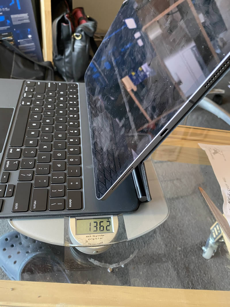 ล่าสุดมีเจ้าของ iPad Pro รุ่น 12.9 นิ้ว ที่ได้รับ Magic Keyboard มาอยู่ในมือแล้ว และนำไปชั่งน้ำหนักให้เราได้ทราบกัน โดยพบว่าเฉพาะตัว Magic Keyboard มีน้ำหนัก 710 กรัม และเมื่อชั่งรวมกับ iPad Pro รุ่น 12.9 นิ้ว ทำให้มีน้ำหนักรวม 1,362 กรัม ซึงมีน้ำหนักมากกว่า MacBook Air 13 นิ้ว (1,290 กรัม) และมีน้ำหนักเกือบเท่า MacBook Pro รุ่น 13 นิ้ว (1,370 กรัม)