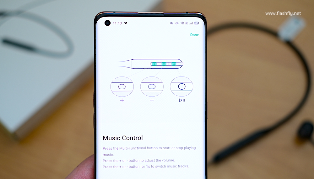 ปลายสายคล้องคอฝั่งซ้ายมือ มาพร้อมปุ่มมัลติฟังก์ชัน, ปุ่มเพิ่มเสียง, ปุ่มลดเสียง และ ไมโครโฟน โดยมีวิธีการควบคุมฟีเจอร์ต่างๆ ด้วยการกดปุ่มเหล่านี้