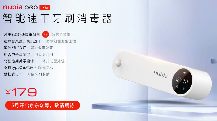 Nubia Neo Smart Sonic Electic Toothbrush และ Neo Smart Toothbrush Sterilizer จะเริ่มวางจำหน่ายในเดือนพฤษภาคมนี้ ในรูปแบบระดมทุนของ Jingdong