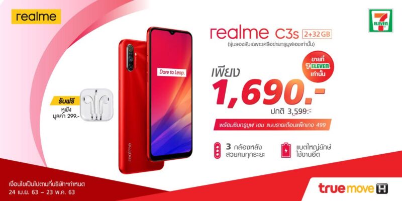 realme C3s ที่วางจำหน่ายใน 7-Eleven มาพร้อมกับซิมรายเดือนจาก ทรูมูฟเอช มีรายละเอียดดังนี้