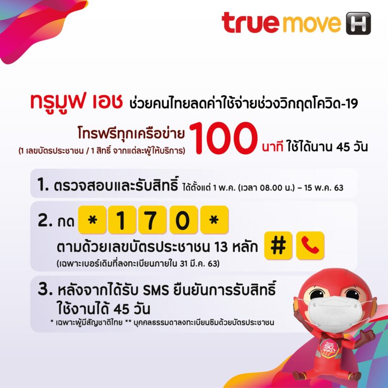 ทรูมูฟ เอช พร้อมช่วยประชาชนลดภาระค่าใช้จ่ายด้านการสื่อสารช่วงวิกฤตโควิด-19 มอบสิทธิ์ให้ลูกค้าทรูมูฟ เอช โทรฟรีทุกเครือข่าย 100 นาที ใช้ได้นาน 45 วัน เพื่อให้ลูกค้าสามารถใกล้ชิดกันได้แม้ต้องรักษาระยะห่างทางสังคม (Social Distancing) ผ่านการสื่อสารบนเครือข่ายที่ดีที่สุดจากทรูมูฟ เอช และสอดคล้องตามแนวทางของรัฐบาล และ กสทช. ในการสนับสนุนให้คนไทยอยู่บ้าน หยุดเชื้อ เพื่อชาติ โดยลูกค้าทรูมูฟ เอช ทั้งแบบเติมเงินและแบบรายเดือน สามารถกด *170* เลขบัตรประชาชน 13 หลัก #โทรออก เพื่อรับสิทธิ์ได้ตั้งแต่วันที่ 1-15 พฤษภาคม 2563