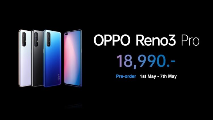OPPO Reno3 Pro ราคา 18,990 บาท เปิดให้สั่งจองล่วงหน้า 1-7 พฤษภาคม 2563 พร้อมโปรโมชั่นพิเศษแถมรวมมูลค่ากว่า 7,990 บาท กระเป๋า OPPO Backpack ,บัตร E-VIP Service ประกันหน้าจอแตกนาน 1 ปี และส่วนลดพิเศษ 500 บาทในวันรับเครื่อง