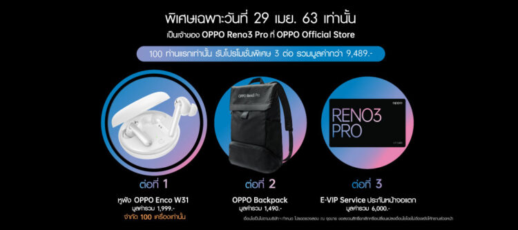 ข่าวดีสำหรับแฟน OPPO Reno3 Pro กับโปรโมชั่นพิเศษ 100 ท่านแรกที่กดสั่งซื้อผ่านทาง OPPO Official Store ไม่ต้องจองและรอรับเครื่องอีกที สั่งวันนี้จัดส่งพรุ่งนี้ ได้ OPPO Reno3 Pro รุ่นใหม่ใช้ก่อนใครเลย พร้อมของแถมพิเศษรวมมูลค่าทั้งหมด 9,489 บาท