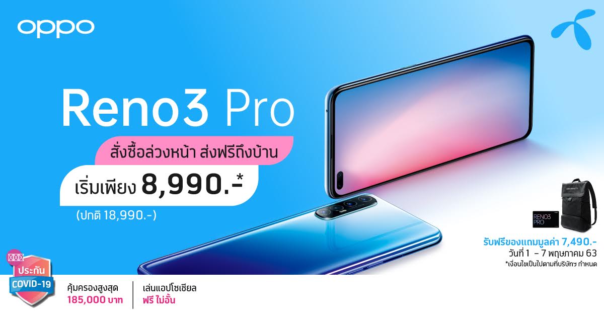 โดยครั้งนี้ OPPO ได้ผนึกกำลังกับดีแทค จัดโปรโมชั่นสุดคุ้มมอบส่วนลดสูงสุด 10,000 บาท เมื่อจอง OPPO Reno3 Pro พร้อมแพ็คเกจที่กำหนด โดยเริ่มต้นเพียง 8,990 บาท จากปกติ 18,990 บาท พร้อมรับฟรี OPPO E-VIP Service รับประกันหน้าจอนาน 1 ปี และ OPPO Backpack มูลค่ารวม 7,490 บาท และรับของแถมเพิ่มอีกหนึ่งต่อ ฟรีประกัน COVID-19 และเล่นแอปโซเชียลฟรีไม่อั้นเมื่อจองกับ ดีแทค โดยสามารถจองได้แล้วตั้งแต่วันที่ 1 พฤษภาคม 2563 – 7 พฤษภาคม 2563 ที่ศูนย์บริการดีแทคทั่วประเทศ และ dtac online store เร็วๆ นี้ ลูกค้าสามารถติดตามรายละเอียดโปรโมชั่นเพิ่มเติมได้ที่ https://www.dtac.co.th/oppo/oppo-reno-3pro.html อย่ารอช้าของแถมมีจำนวนจำกัด