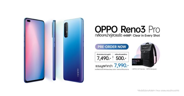 OPPO Reno3 Pro เป็นสมาร์ทโฟนรุ่นแรกที่มี Ultra Night Selfie Mode ในกล้องหน้า มืดแค่ไหนก็คมชัด พร้อม Dual lens Bokeh เซลฟี่ละลายหลังได้อย่างมีมิติสวยงามเป็นธรรมชาติ รวมทั้งดีไซน์ที่ออกแบบมาให้มีความเบา บาง และโดดเด่น ด้วยการไล่เฉดสี ซึ่งมีด้วยกันทั้งหมด 3สีคือ สีน้ำเงิน Auroral Blue, สีดำ Midnight Black และ สีขาว Sky White Limited Edition ที่และยังมาพร้อมกล้องหลังถึง 4 ตัว คมชัดสูงสุด 64MP ที่ถ่ายภาพได้ทุกสถานการณ์ทั้งภาพมุมกว้าง ภาพบุคคล ภาพซูมที่สามารถซูมดิจิตอลได้ถึง 20 เท่า และฟังก์ชั่น Ultra Clear 108MP Image เพิ่มคุณภาพการถ่ายภาพให้เก็บได้ทุกรายละเอียด นอกจากนี้ ยังมีUltra Steady Video 2.0 ถ่ายวิดีโอได้นิ่งทุกช็อต พร้อมฟังก์ชั่น Video Bokeh, Video Zoom และ AI Beauty Mode รวมถึงแอป SOLOOP แอปสำหรับตัดต่อวิดีโอเสมือนมืออาชีพ ในส่วนของสเปคนั้น OPPO Reno3 Pro ยังมี RAM 8GB + ROM 256GB และเทคโนโลยีชาร์จไว 30W VOOC Flash Charge 4.0 ที่สามารถชาร์จแบตเตอรี่ได้ 50 เปอร์เซ็นต์ภายใน 20 นาที