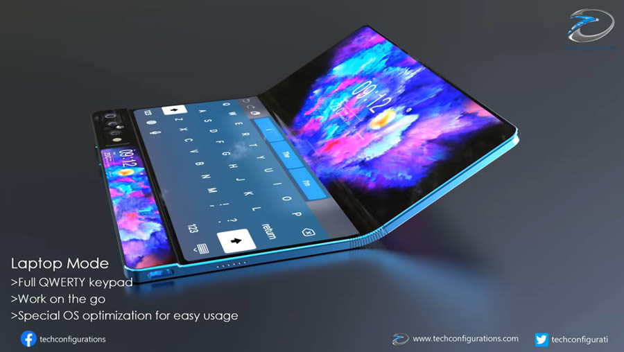 TechConfigurations แชร์คอนเซ็ปต์ Samsung Galaxy Fold 2 ที่มาพร้อมจอแสดงผล 3 หน้าจอ โดยด้านหน้ามีจอแสดงผล AMOLED ขนาด 6.6 นิ้ว สำหรับใช้งานในรูปแบบสมาร์ทโฟน และมีจอ OLED ขนาดเล็ก เป็นจอรอง เมื่อกางออกจะพบกับจอแสดงผลหลักที่พับได้ มีขนาด 8 นิ้ว ซึ่งสามารถกางออกจนสุดเพื่อใช้งานในรูปแบบแท็บเล็ต หรือกางออก 120 องศา เพื่อใช้งานในรูปแบบแล็ปท็อป