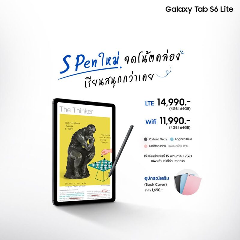 กาแลคซี่ แท็บ เอส 6 ไลท์ วางจำหน่ายอย่างเป็นทางการแล้ววันนี้ ในราคาเริ่มต้นเพียง 11,990 บาท สำหรับรุ่น Wi-Fi และ 14,990 บาท สำหรับรุ่น LTE นอกจากนี้ยังมีอุปกรณ์เสริมอย่างเคส Book Cover มาพร้อมที่เก็บ S Pen สามารถปรับมุมมองได้ 3 ระดับในราคา 1,690 บาท ที่ Samsung Experience Store และ Samsung.com ผู้ที่สนใจสามารถดูรายละเอียดเพิ่มเติมและสั่งซื้อได้ที่ https://www.samsung.com/th/tablets/galaxy-tab-s6-lite/buy/