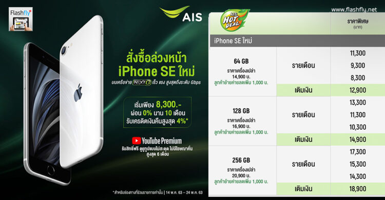 AIS เปิดให้สั่งซื้อ iPhone SE รุ่นที่ 2 ล่วงหน้าแล้วในราคาเริ่มต้นเพียงเริ่มเพียง 8,300 บาท ผ่อน 0% นาน 10 เดือน รับเครดิตเงินคืนสูงสุด 4% หรือ ผ่อน 0% นานสูงสุด 24 เดือนรับส่วนลด 20% สำหรับซื้อ AirPods (จำนวนจำกัด) รับสิทธิ์ฟรี ดูยูทูปไม่สะดุด ไม่มีโฆษณาคั่น สูงสุด 6 เดือน รับสิทธิ์ใช้ Apple TV+ นาน 1 ปี