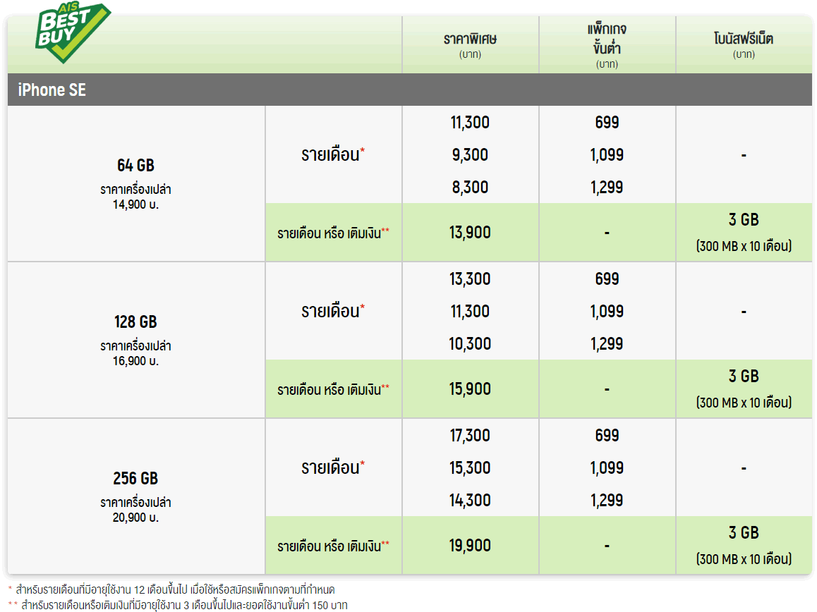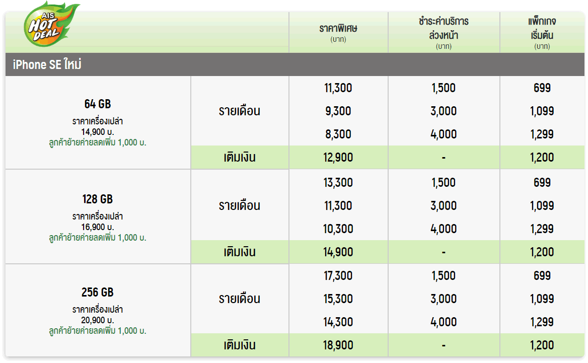 AIS Hot Deal นำเสนอ iPhone SE รุ่นที่ 2 ในราคาเริ่มต้น 8,300 บาท สำหรับรุ่น 64GB เมื่อซื้อพร้อมสมัครแพ็กเกจ 4G Hot Deal XTRA เริ่มต้น 1,299 บาท ชำระค่าบริการล่วงหน้า 4,000 บาท (ย้ายค่าย เบอร์เดิม ลดเพิ่ม 1,000 บาท)